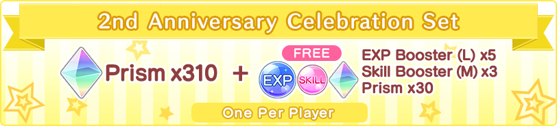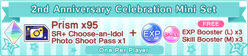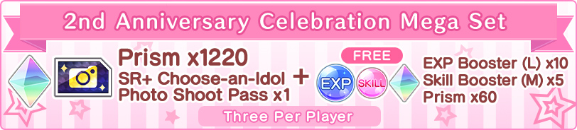 To celebrate the 2nd anniversary of the global release of the game, special sets that include an SR+ Choose-an-Idol Photo Shoot Pass and Prisms are on sale for a limited time. For details, see the in-game Shop.